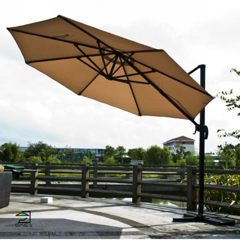 Размер: 3,0 м. Материал: плотная ткань 250 гр/м2 полиэстр с водоотталкивающей пропиткой. Труба профильная алюминиевая 53*77 мм, 8 спиц D25*18 мм. Педаль-рычаг в основании стойки для вращения на 360 градусов. Стальное крестообразное основание в комплекте. Упаковка - 1 шт. Цвет: темно-бежевый. Плиты 50x50 не входят в комплект.